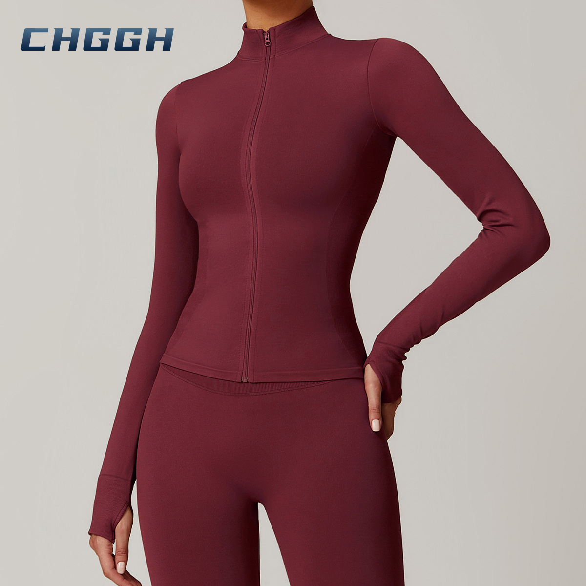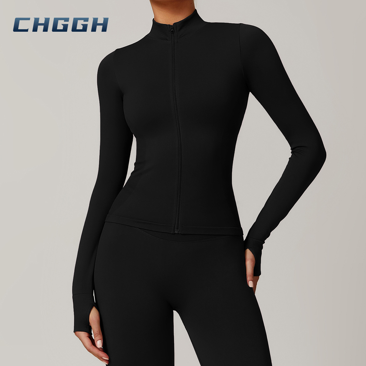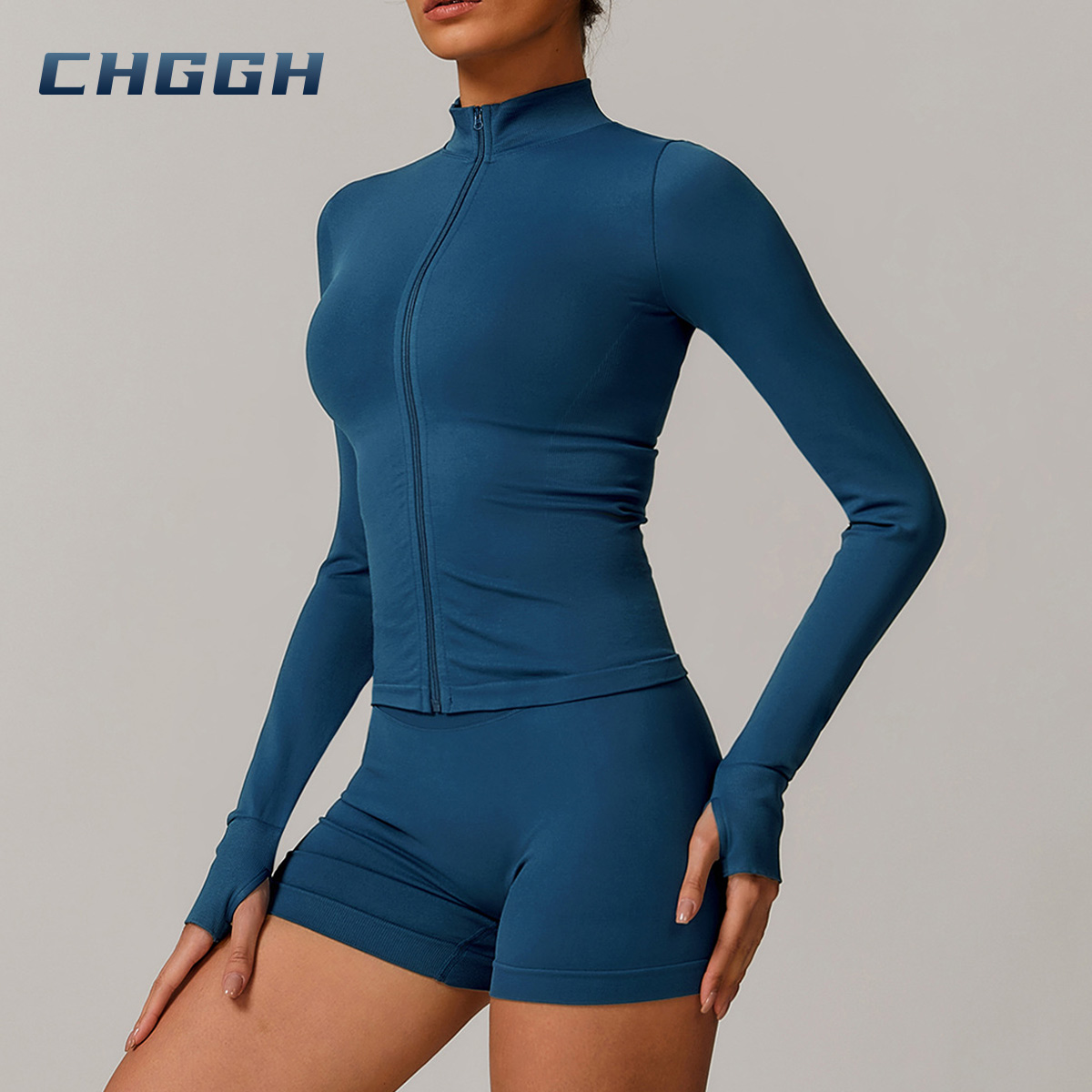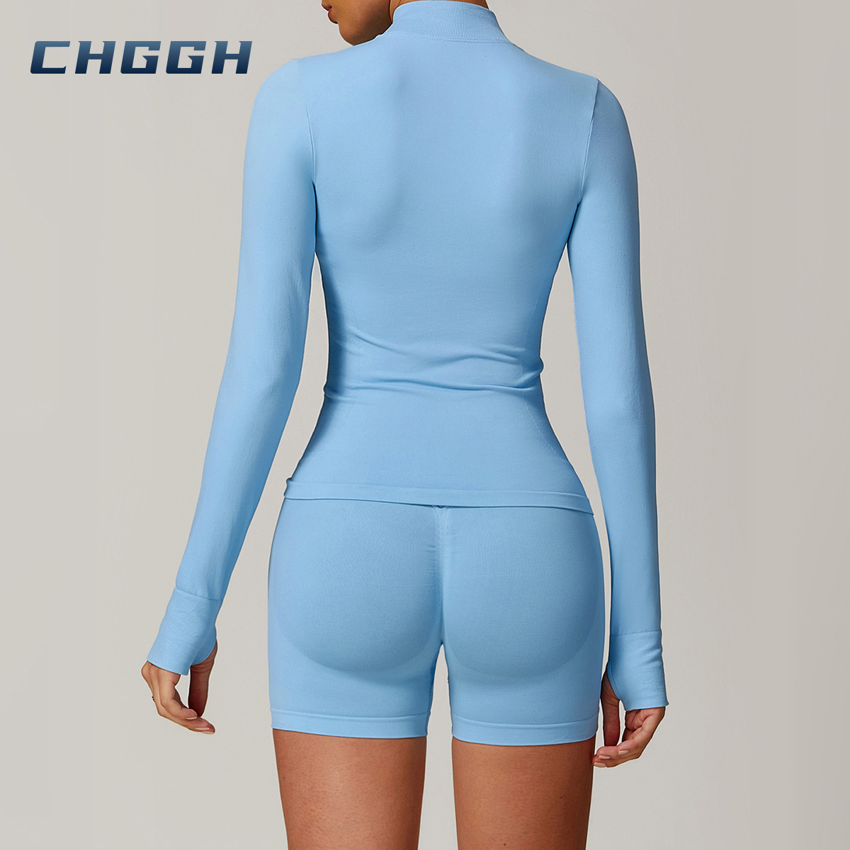 Tops e shorts femininos de manga comprida com zíper sem costura