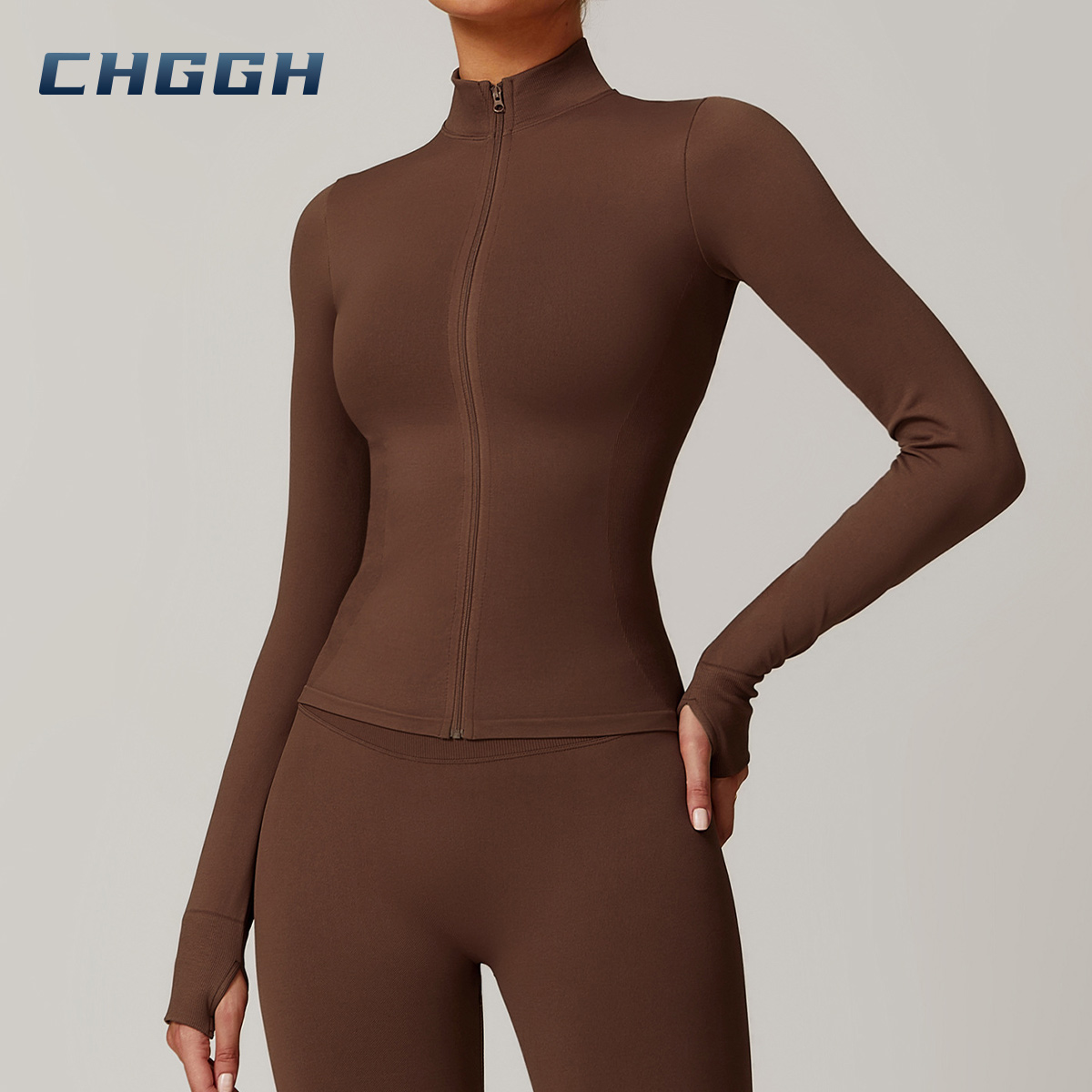 Novo top de manga comprida sem costura com meia zíper e leggings, o top com zíper destaca a plenitude do peito.